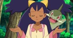 Iris apologized to Pikachu. She told Ash about the great thunder that happened the other day. Ash told her "Sure was Professor Juniper said Zekrom caused all that lightning." Iris gasped "Zekrom, the legendary Pokémon caused it?! Please, I want to know everything?!" Iris got interrupted, Pikachu pointed at a Pokémon. Ash looked at the Pokémon "The Pokémon from yesterday!" Ash ran with the Pokémon and Iris caught up with him.