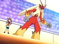 May's Combusken evolved into a Blaziken after a battle with Team Rocket in the episode Once More With Reeling. She then used her new Blaziken in a Pokemon Contest against Ash's Sceptile.