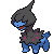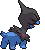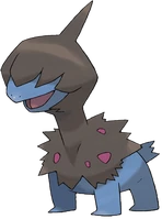 Deino is a small, blue dinosaur-like Pokémon with black fur covering its neck and most of its head. It has a small tail and a tuft of fur atop its head. The pink marks around its collar are wounds.