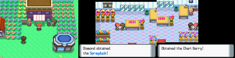 There is a Flower Shop in this town. Outside the shop, there are two berries planted. Pick them up as they are very useful. Go inside and talk the girl at the most left. She will give you a Sprayduck, a watering can shaped like a Psyduck. You can use it to water the berries you have grown in the soil. Then talk to the girl at the right. She will give you one berry everyday, so if you want to get berries, get from her. At the counter, a woman there is trading for berries for accessories. If you want to accessories to decorate your Pokémon, ask her and trade for the required amount of berries. Refer the list above for more details.