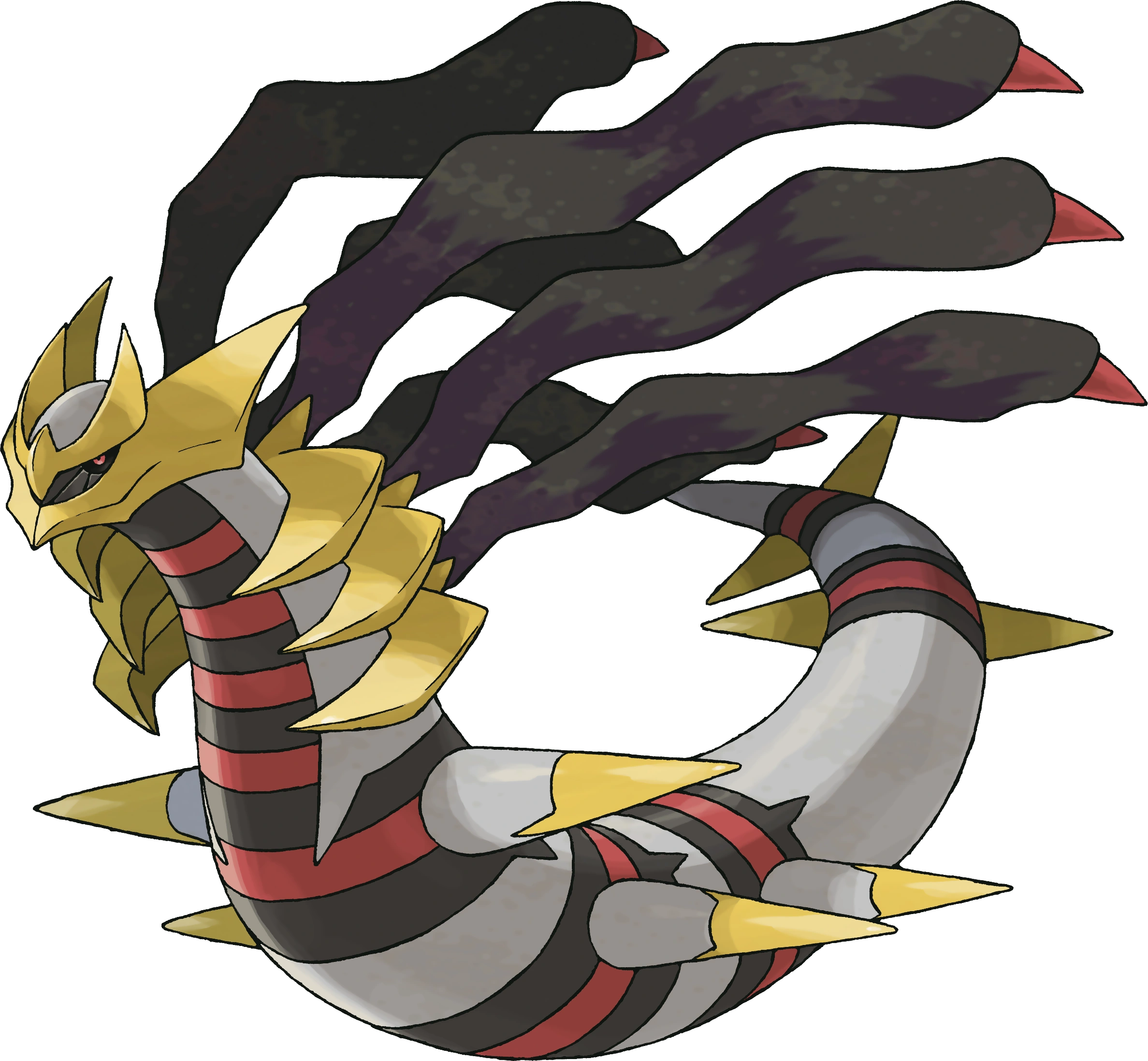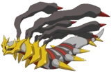 Giratina's Altered Forme is a giant, dragon-like Pokémon, with an appearance similar to that of a large sauropod. It has 6 legs, gold protrusions that look like external ribs, and golden horns on its head. Its neck has five red stripes and 4 black stripes. On its back, it has a black stripe pattern that extends to its legs. It has black wings with three red thorn-like appendages called Girasols (a rare type of opal) coming out of them. Giratina's Origin Forme is more serpentine (like an amphiptere) than its Altered Forme. Its wings are now shaped like tentacles with the red thorn-like appendages sticking out at the end. Its mouth is now behind the two appendages in front of its face. They open when Giratina roars or etc. The horns on its head are still the same. Giratina in Origin Forme has five rows of golden spikes protruding out of the torso and near the tail. Five gray and red stripes are partially overlapped by these spikes.
