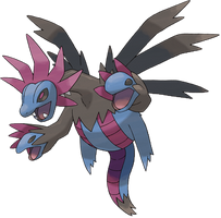 Hydreigon (Japanese: サザンドラSazandora) is a Dark/Dragon-typePseudo-Legendary Pokémon and is the final evolution form of Deino and the evolution of Zweilous. It now has a head on each of its arms, creating a Hydra-like evolution stage. It also has three pairs of wings.