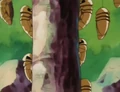 The match between Ash and Samurai's Metapods is again shown, with Ash and Samurai falling over due to their continued exposure to the sun. A Beedrill swarm then appears in the distance and Samurai recalls his Metapod and runs away. A Beedrill flies down and steals Metapod, which Ash attempts to recall. Another Beedrill attempts to attack but Pikachu uses its thundershock on Ash, Misty and the Beedrill to send it flying away. The three begin to run off, catching up with Samurai, but manage to avoid the Beedrill by hiding behind a bush. The three, however, run into a hive of Kakuna. Ash spots Metapod and talks loudly, resulting in the Kakuna noticing them and evolving into Beedrill.