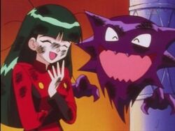 Ash, Misty, and Brock have returned to Saffron City with Ash's new Pokémon, Haunter, who will hopefully help him win aganist Sabrina. Ash is feeling confident. Brock is a little bit afraid of Haunter but Misty isn't. Misty gives Haunter a hug and Haunter licks her face, paralizing her. Ash scolds Haunter and its cries, but Ash cheers it up. Ash asks Haunter to help him defeat Sabrina and Haunter agrees.