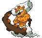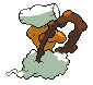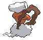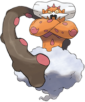 Landorus is a somewhat muscular crimson-colored Pokémon, with red markings covering its body. Its forehead protrudes three spikes. It rides around in a cloud with a brown, tentacle-like tail sticking out, which is said to contain nutrients for the soil. This Pokémon rides in the cloud in a sitting position.