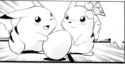 | It occasionally uses an electric shock to recharge a fellow Pikachu that is in a weakened state. | |