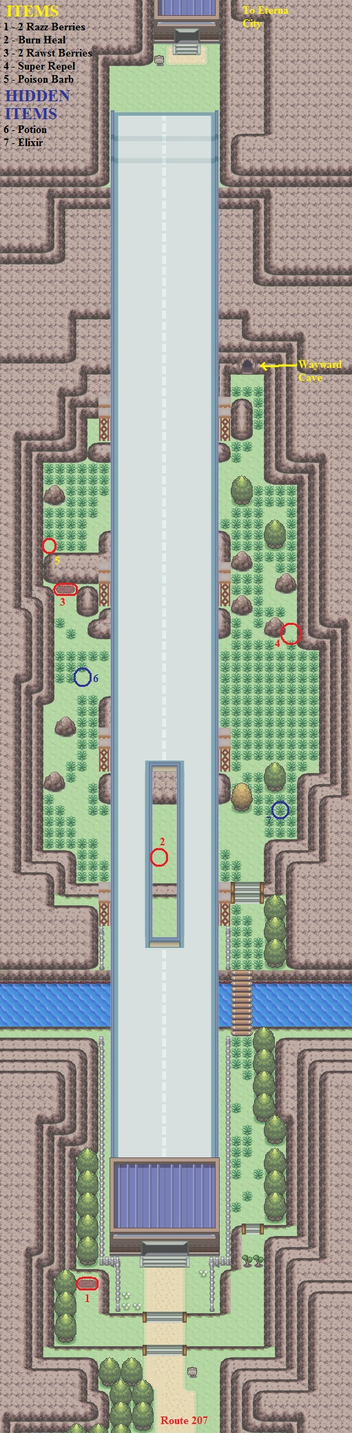 This route lies between Eterna City and Route 207. This route contains a Cycling Road and a grassy area below it. There is also a cave called Wayward Cave found at the northern part of the grassy patch.