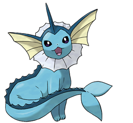 Vaporeon is the result of an Eevee's exposure to the radiation of a Water Stone. Vaporeon is a composite creature sharing physical traits of foxes, turkish van cats, and mermaids/fish. Vaporeon's body is light-blue and has a white collar resembling a ruff. Vaporeon has yellow ears made of webbing and has a fin on its head resembling its ears. Vaporeon has blue ridges that run down the length of its spine and on to its tail-fin. Vaporeon's molecular structure is close to water, and its body glitters when sunlight hits at certain angles because of it.