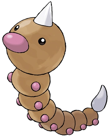 Weedle is a small insect-like Pokémon appearing as a brown caterpillar with large stingers on both its tail and head. Across Weedle's underside are small, pink nubs which it uses to move. On its head, Weedle has two beady black eyes above a large pink nose.