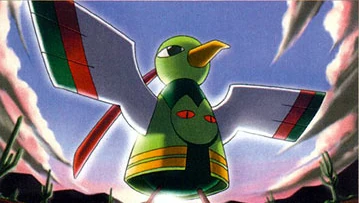 Xatu are a green bird-like Pokémon with features resembling that of a totem pole. Much larger than their pre-evolved form, Natu, Xatu have large, white wings that they usually place in front of them, almost covering their entire front. On Xatu's chest, there is a patch of green with a pattern in it that resembles two eyes.